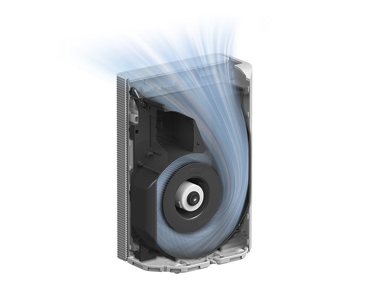 يعمل جهاز تنقية الهواء على تدويرالهواء من الجدار إلى الجدار بكفاءة، وذلك بفضل شكله الفريد الذي يتلاءم بشكل طبيعي مع أي ركن - ومع ذلك، فأنت بالكاد سوف تلاحظ وجوده. وستسمح لك عجلاته الأربع بنقله من غرفة إلى أخرى بسهولة. وفي أثناء الليل، عند ضبطه على وضع السكون، يخفت ضوء شاشة LED تلقائيًا وتنخفض الأصوات إلى 28 ديسيبل*1 لتضمن حصولك على نوم هادئ ومريح. ويتوافق جهاز تنقية الهواء تلقائيًامع مع تصميم غرفتك ومحتوياتها ويعمل وفقًا لنمط حياتك.