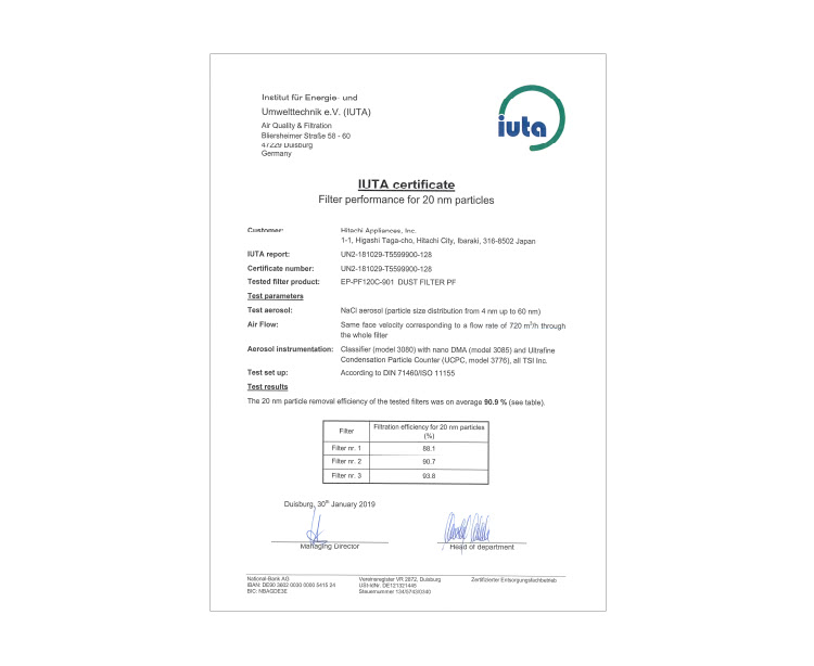 هذا هو التأثير على الفيروسات والبكتيريا المحمولة بالهواء بعد 13 دقيقة في مساحة اختبار مقدارها 25 م3، وليس التأثير الذي تم إثباته في مساحة استُخدِم فيها الفلتر فعليًا. وقد تختلف التأثيرات وفقًا لشروط الاستخدام وطريقته. تتوافق الاختبارات التي يتم إجراؤها مع معيار رابطة مصنعي الأجهزة الكهربائية في اليابان (JEM1467).