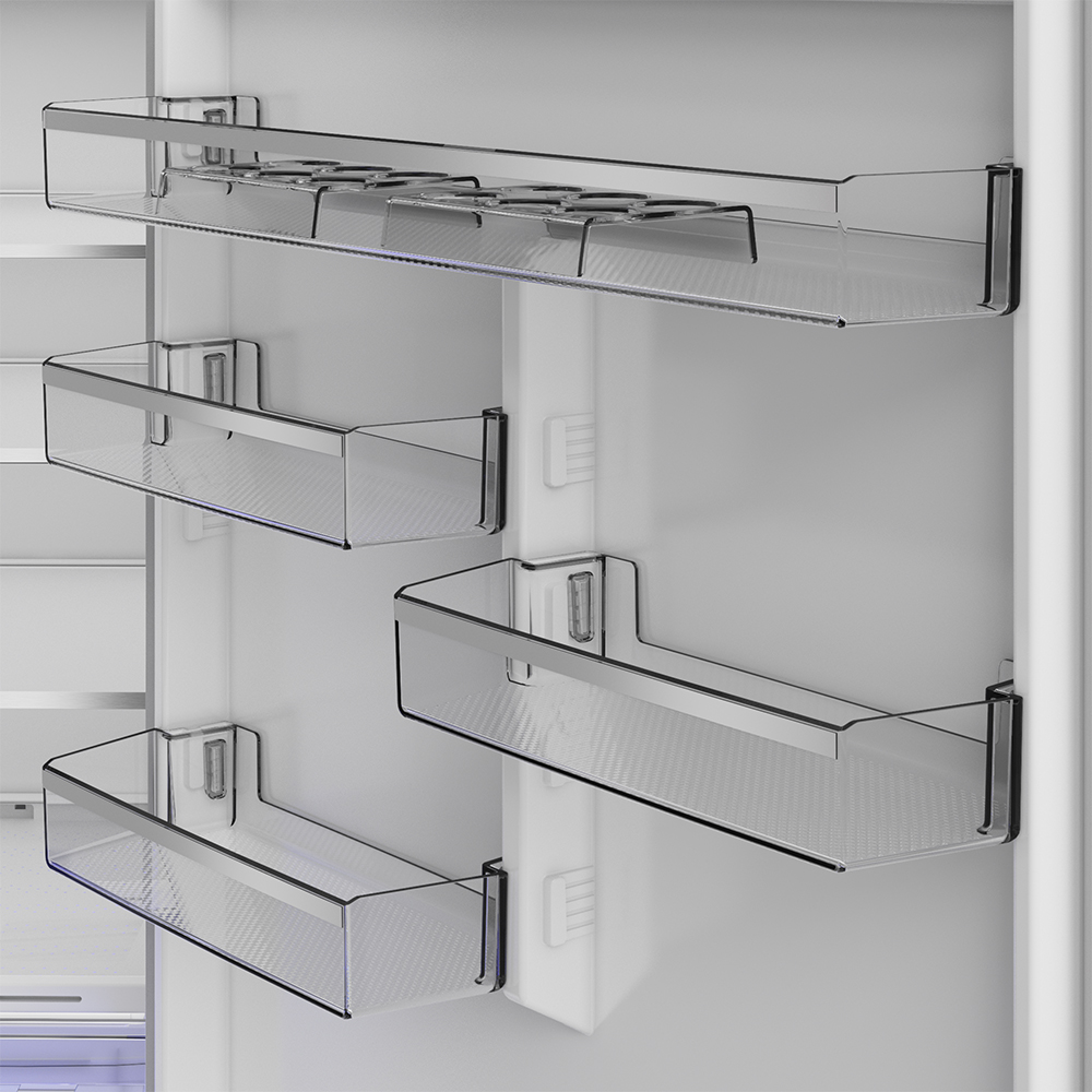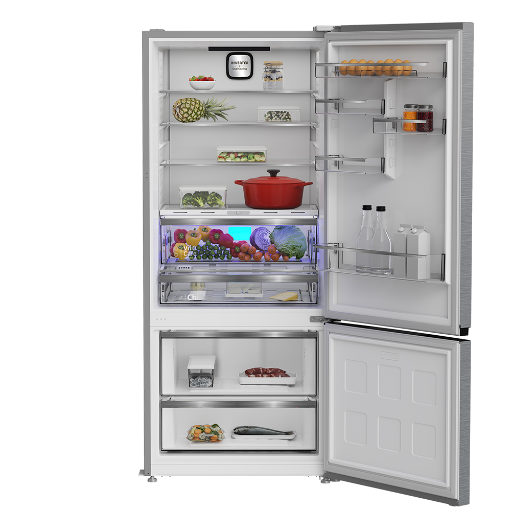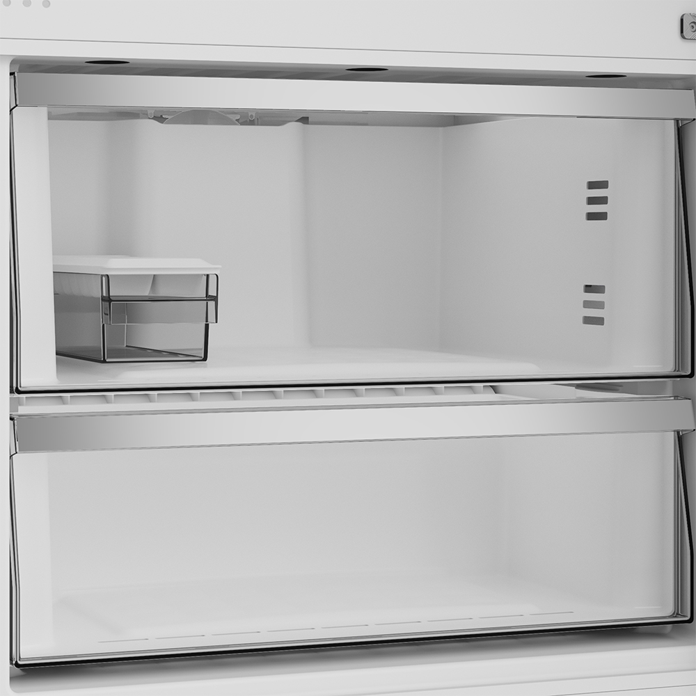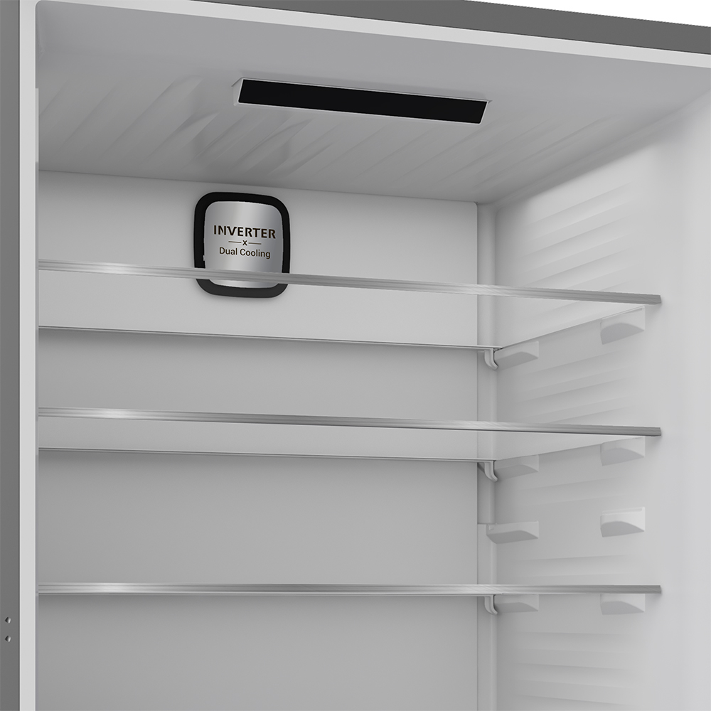Provides optimum cooling in both the freezer and refrigerator compartments by separate cooling systems for each compartment. Inverter-supported dual cooling technology maintains an ideal air flow and optimal temperatures. It’s efficient inverter compressor generates a large volume of chilled air to keep your food fresh with no frost build-up. Also prevents the odour transfer between the freezer and fresh food compartments.